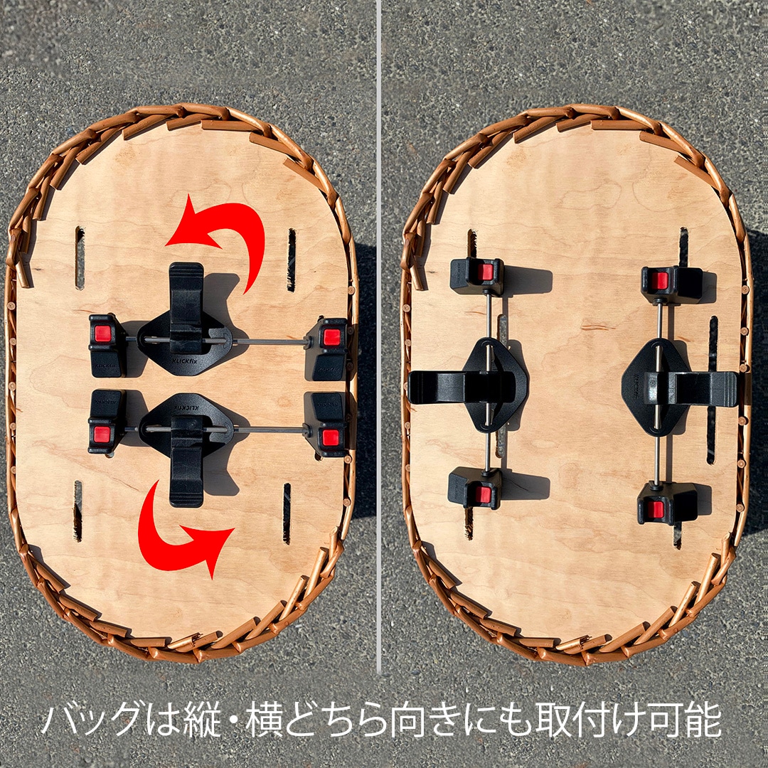 コーブクリップは、キャリアの幅に合わせてバッグを手軽に着脱できるシステムです。クリップ幅を自由に調節し、キャリア幅は9〜40cmまで対応します。