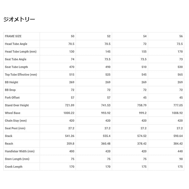 | 適正身長 | 50cm:152cm-160cm 52cm:160cm-168cm 54cm:168cm-175cm 56cm:175cm-183cm |