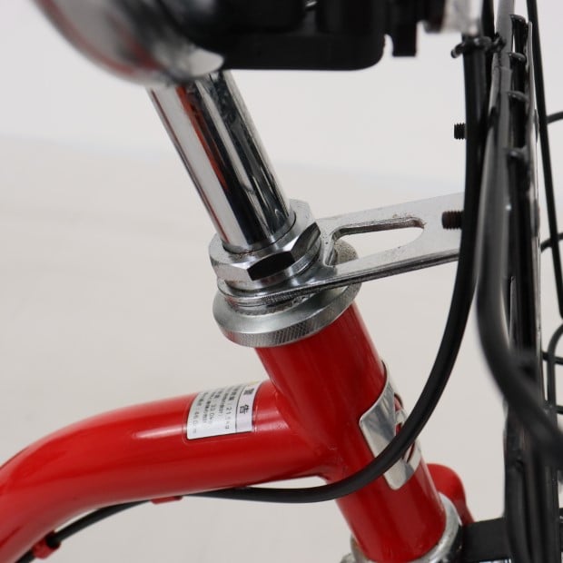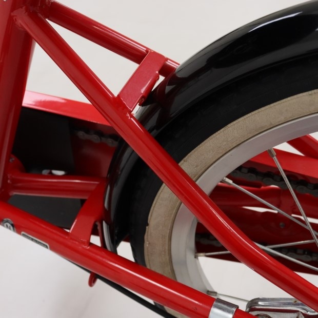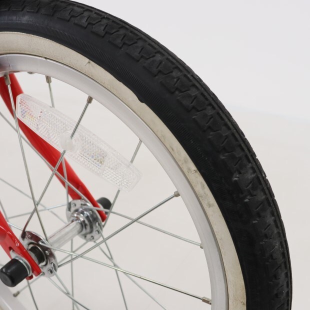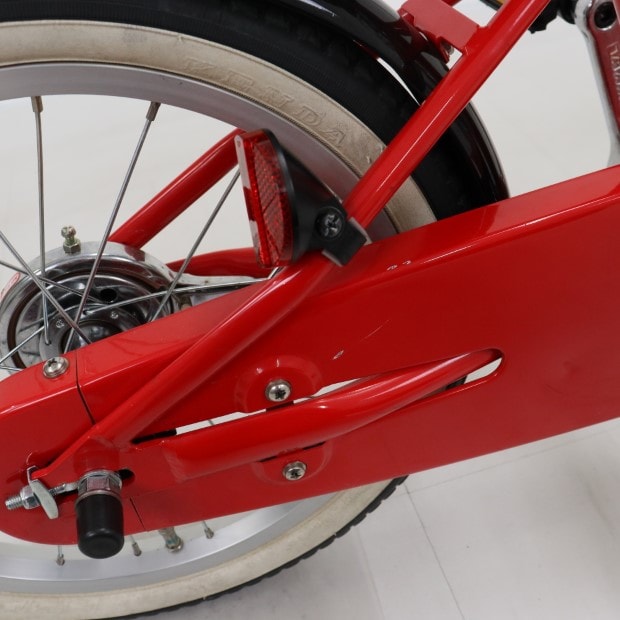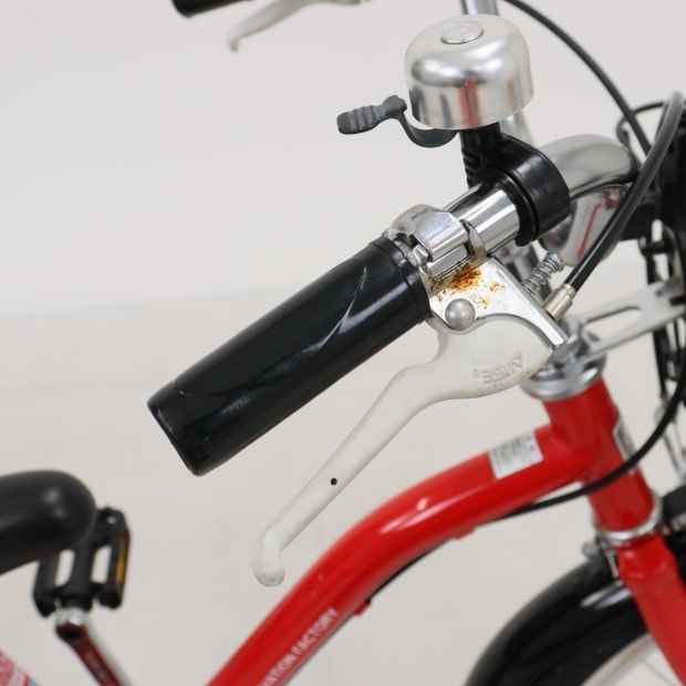 一部に傷や錆がありますが、比較的状態の良い車体です。補助輪がスタンドに交換されています。前カゴ、泥除けが後付けされています。ステムカバー欠損。