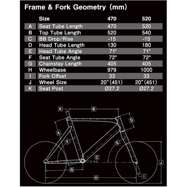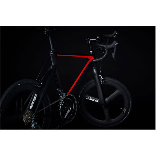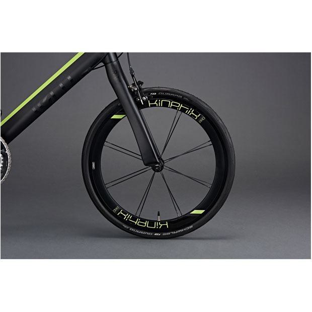 新たに開発されたカーボンフォークを採用。ロングブレ一ドのフォ一クを採用することで車体全体がシャープな印象に。通常のミニべロよりもステアリングのへッド位置が高くなるため、ミニベロ特有のハンドリング時のふらつきを軽減し、より安定したコーナリングを行うことができます。別売りのKitt design 451 Carbon Tri-spoke Wheelとの併用で更なるグレードアップを提案。