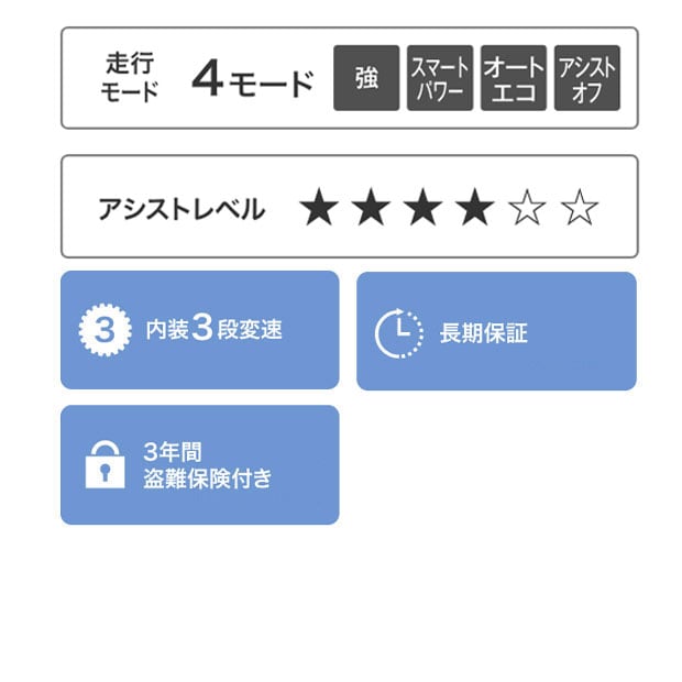 | 盗難抑止装置 | 1キー3ロック(ワイヤー錠、サークル錠、バッテリーロック) ディンプルキー |