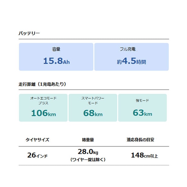 | 一充電走行距離?(注2) | 強モード:63km スマートパワーモード:68km オートエコモード:106km |