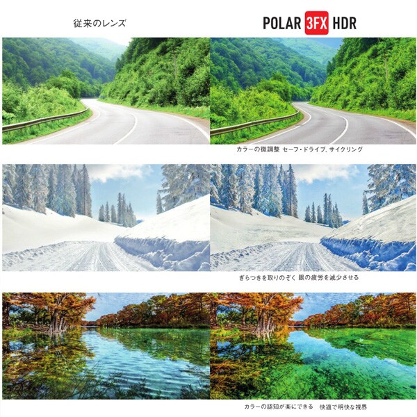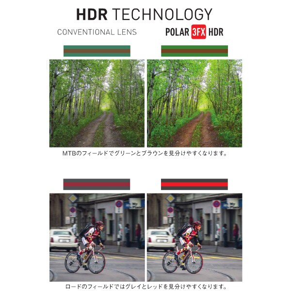 有害な紫外線をブロックし、ぎらつきをなくしながら眼に害のない周波数帯の光線のみを透過させることで眼を守ります。自動車のヘッドライトや太陽光線、濡れた路面や雪面の照り返しにフィルターをかけるよう設計されています。 HDR(ハイ・ダイナミック・レンジ)フィルターは、街中で、山で、そしてロードでコントラストを強調して安全を確保するのです。明るく快適な視界、細かい部分までよく見ることができ、色彩を鮮明にすることで眼の疲労を防ぎます。