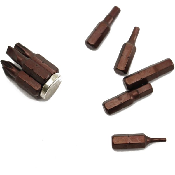 コンパクトなボディ、270度可動するヘッドと細かなノッチ数で小さなスペースでも作業が出来るように設計されたラチェットハンドル。10種類の付属ビットは工具内に収納。携帯性に優れ、ビットの紛失等も防止します。ビットは軸対辺6.35mm(1/4インチ)の六角形状。磁石付きで装着したビットをしっかりホールドします。