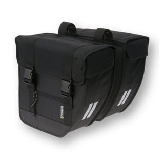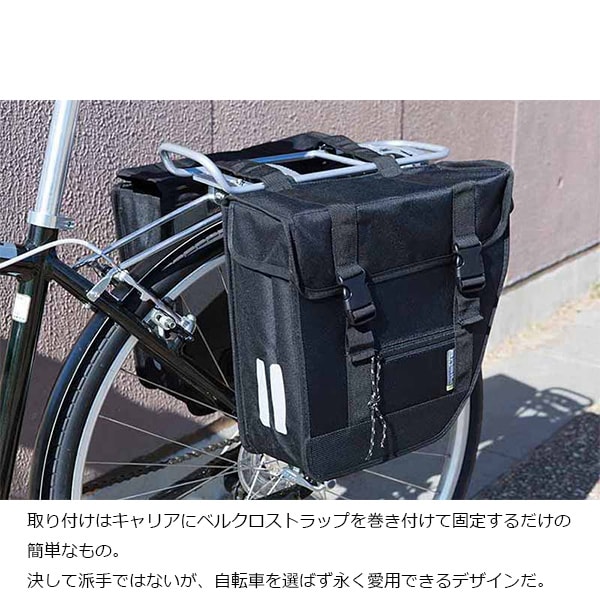 ベルクロストラップで自転車のキャリアに簡単に取り付けられるツアーダブルバイクバッグ。決して派手ではないが、自転車を選ばず永く愛用できるデザイン。
