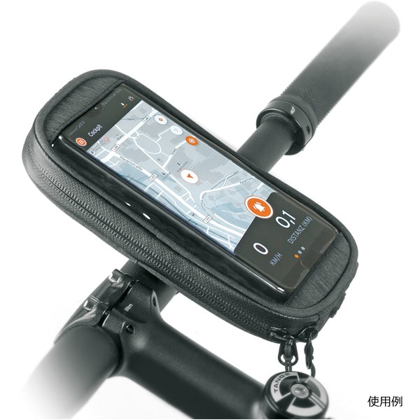 耐水性のある生地と止水ジッパーを採用した安心設計で、タッチパネルに対応したスマートフォンホルダー。