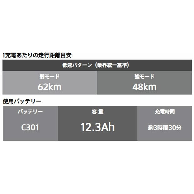 | 1充電あたりの走行距離の目安(低速パターン・バッテリー新品時) | 弱モード:62km 強モード:48km |