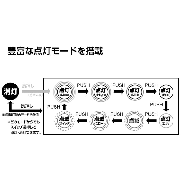 | 点灯時間(約) | 1時間(Maxモード)/ 2時間(Highモード)/ 3時間(Midモード)/ 7時間(Ecoモード)/ 35時間(Day Lightモード)/ 10時間(点滅)/ 10時間(スロー点滅)/ 50時間(クイック点滅) |
