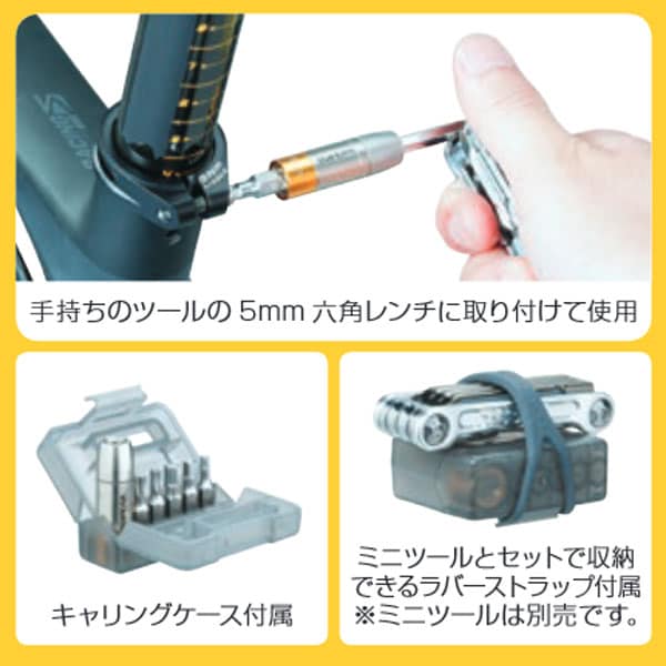 手持ちのツールがトルクレンチに変身!5mm 六角レンチにトルクソケットを取り付け、ビットを差し替えて使用する単能形トルクレンチセット。