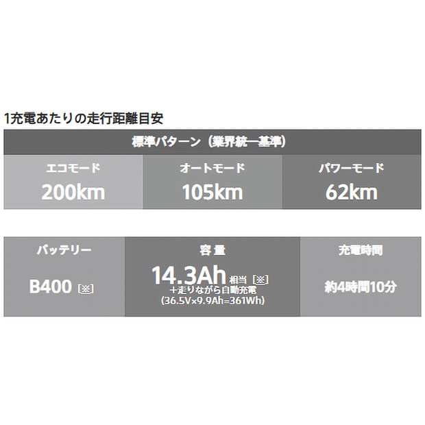 | 1充電あたりの走行距離の目安(標準パターン・バッテリー新品時) | エコモード:200km オートモード:105km パワーモード:62km |
