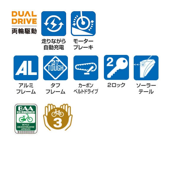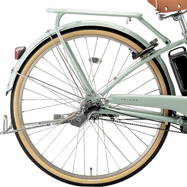 DUAL DRIVE(両輪駆動)モデルは、チェーンではなく、カーボンベルト。だから、サビない、はずれない。しかもチェーンの5倍以上長持ち。