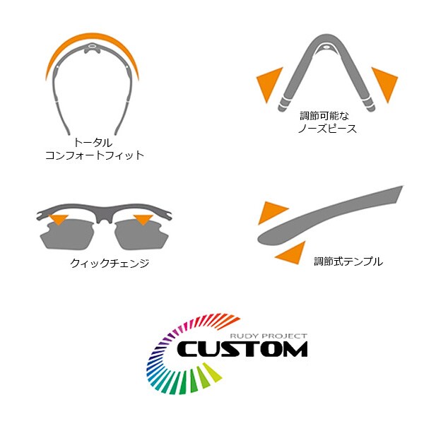 特殊な工具などは必要なく、360度全方向へテンプル先端の角度を簡単に変えることができます。さらに、調整可能なノーズピース(エルゴノーズ・システム)は非常に快適でさまざまな顔面形状に適合します。同時に、顔からレンズまでの距離を調整でき、レンズのくもりを防ぐことも可能です。ルディプロジェクト独自の機構によって、テンプルやノーズパッドを交換することも可能です。