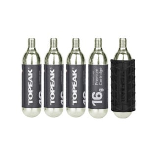 16g CO2カートリッジ5本セット。凍傷を予防するためのスリーブが付属しています。