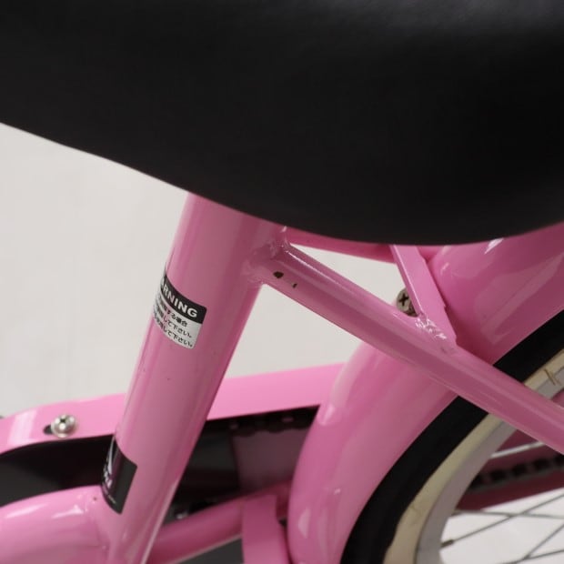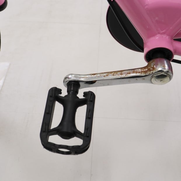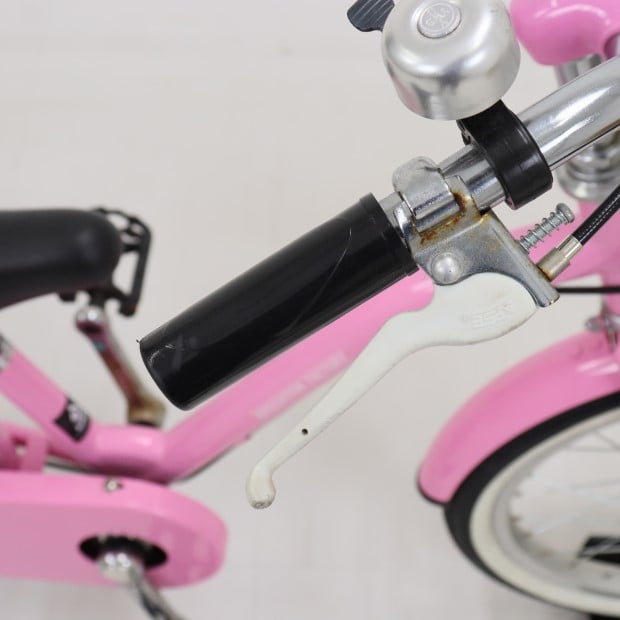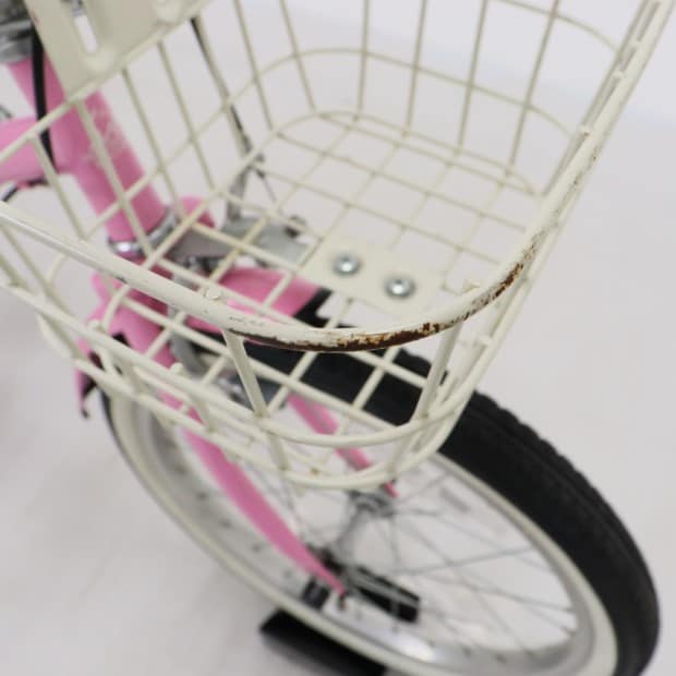 一部に傷や錆がありますが、比較的状態の良い車体です。補助輪がスタンドに交換されています。前カゴ、泥除けが後付けされています。