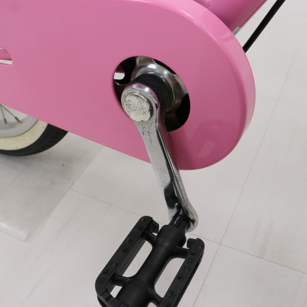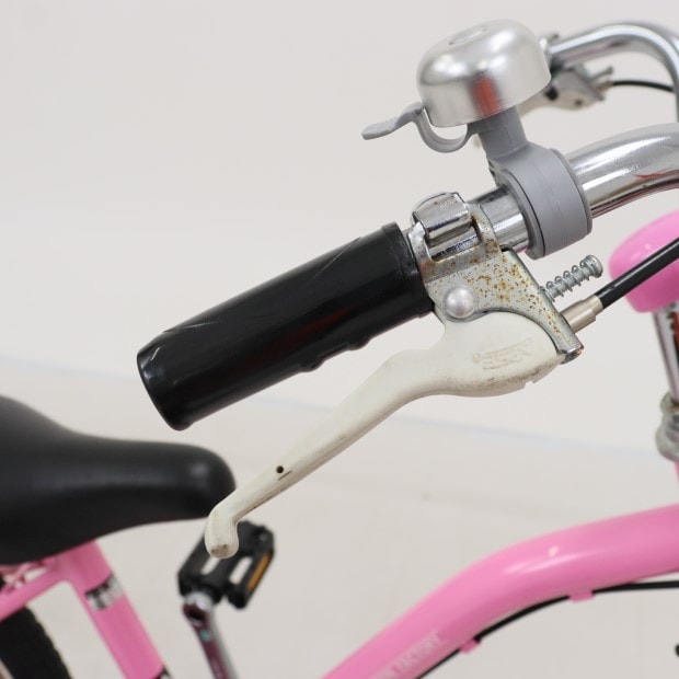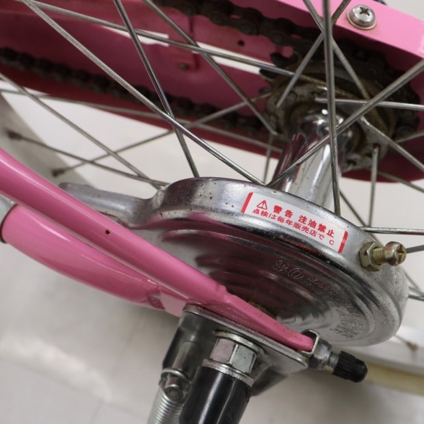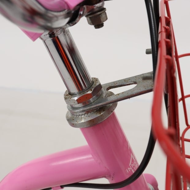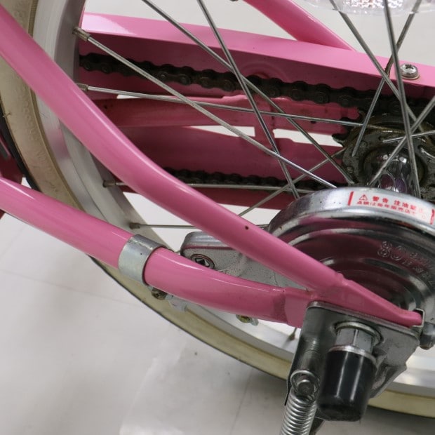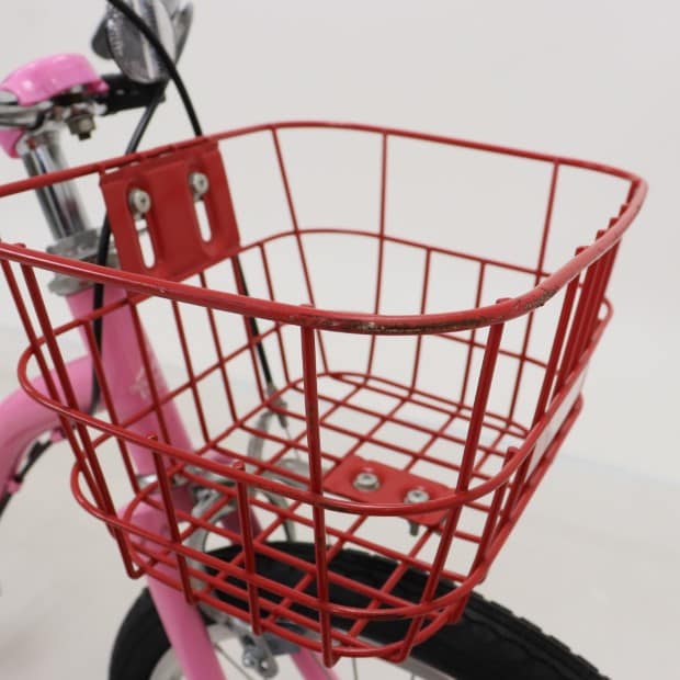 一部に傷や錆がありますが、比較的状態の良い車体です。補助輪がスタンドに交換されています。前カゴが後付けされています。