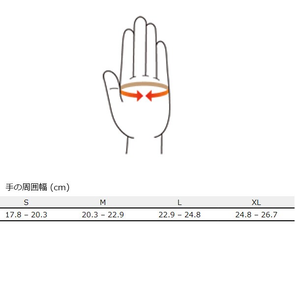 | 素材 | 手のひら側:ポリエステル85%、ポリウレタン15% 手の甲側:ポリアミド38%、クロロプレンゴム26%、ポリエステル20%、ポリウレタン15%、ラバー1% (アルミプリント) |