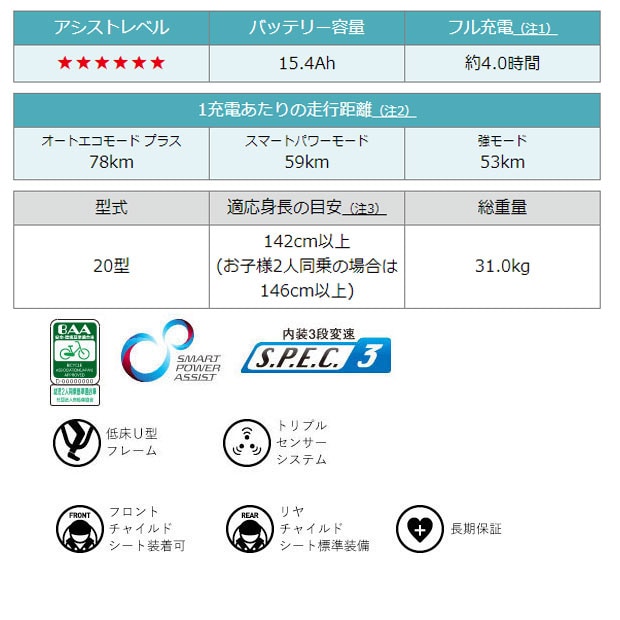 | 一充電走行距離(注2) | 強モード:53km スマートパワーモード:59km オートエコモードプラス:78km |