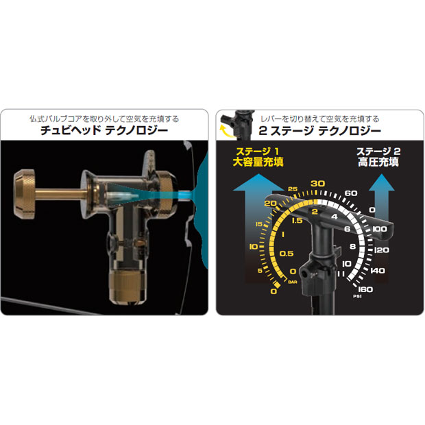 透明なヘッド内で仏式バルブコアが取り外せるチュビヘッド、大容量充填/高圧充填の2 ステージを採用。