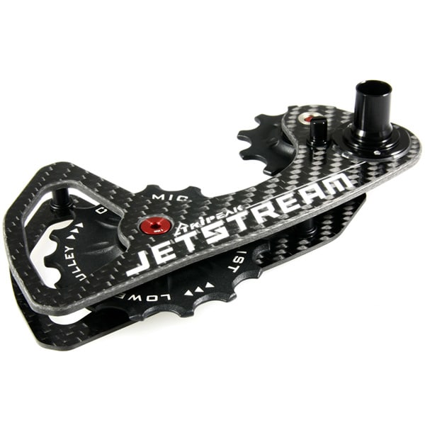 プーリー本体の材質は樹脂製。シマノ・カンパ・スラム全てのコンポーネントブランドが純正プーリーに樹脂製を採用していますが、最も効率が良く信頼性が高い材質は樹脂です。金属の材質を採用したサードパーティ製品も多いですが、どんなに回転の良いベアリングを採用しても、金属のチェーンと金属のプーリーでは噛み合った際に抵抗を生んでしまいます。樹脂の採用はトライピークのこだわりです。