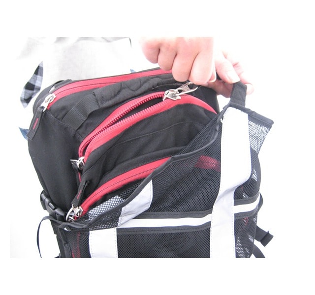 ストラップ部分を左右に動かす事で、バックパックの上部から中身の出し入れを可能にします。
