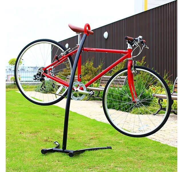 サドルを引っ掛けるだけの簡単ディスプレイスタンド。鍵をかけられるフックも付属しています。