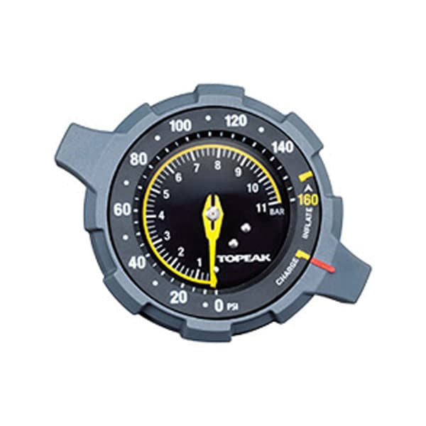 高い位置にマウントされた最大160psiまで測れるダイヤル ゲージ付 (英式バルブの空気圧測定はできません)