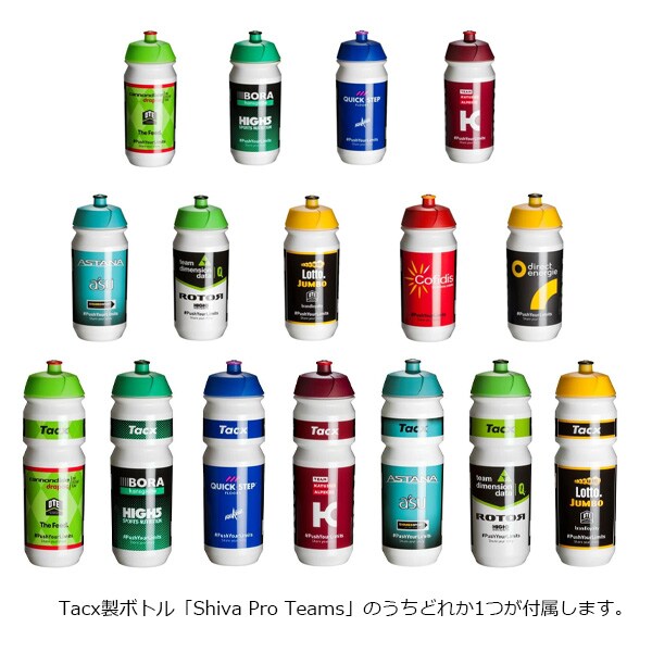 Tacx製ボトル「Shiva Pro Teams」のうちどれか1つが付属します。(ボトルは選べません。)