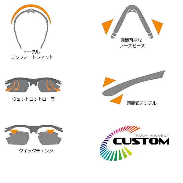 特殊な工具などは必要なく、360度全方向へテンプル先端の角度を簡単に変えることができます。さらに、調整可能なノーズピース(エルゴノーズ・システム)は非常に快適でさまざまな顔面形状に適合します。同時に、顔からレンズまでの距離を調整でき、レンズのくもりを防ぐことも可能です。ルディプロジェクト独自の機構によって、テンプルやノーズパッドを交換することも可能です。