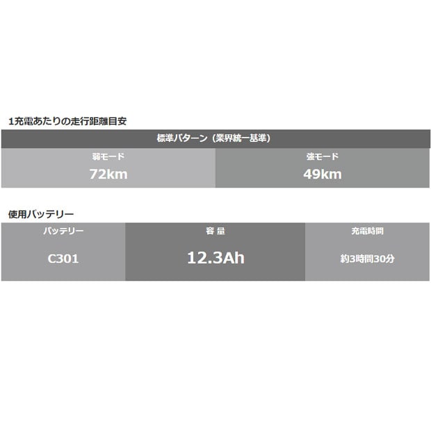 | 1充電あたりの走行距離の目安(標準パターン・バッテリー新品時) | 弱モード:72km 強モード:49km 700~900回 |