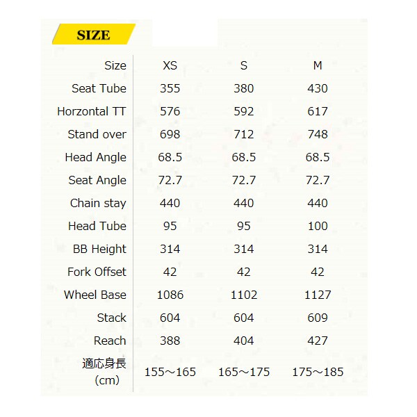 | 適応身長(cm) | 155〜165(XS)、165〜175(S)、175〜185(M) |