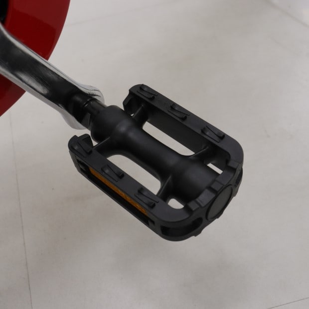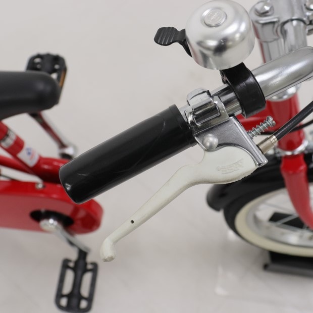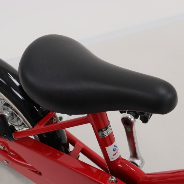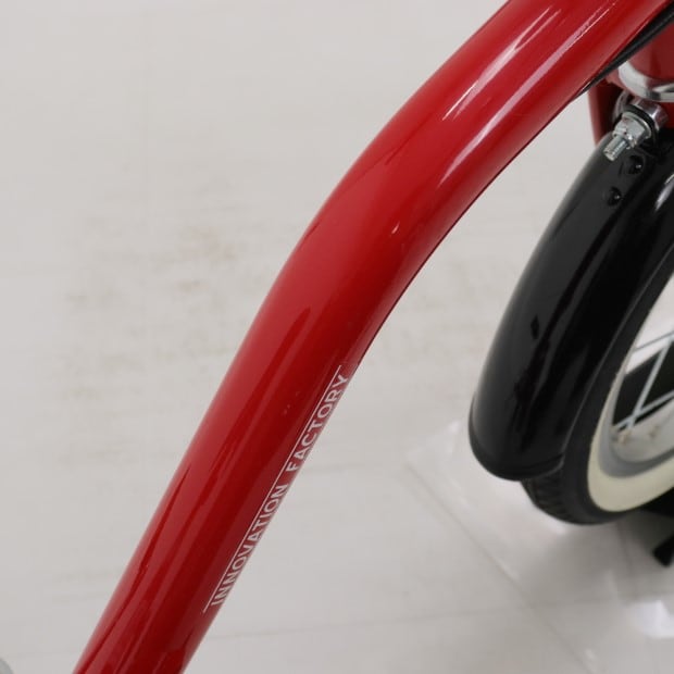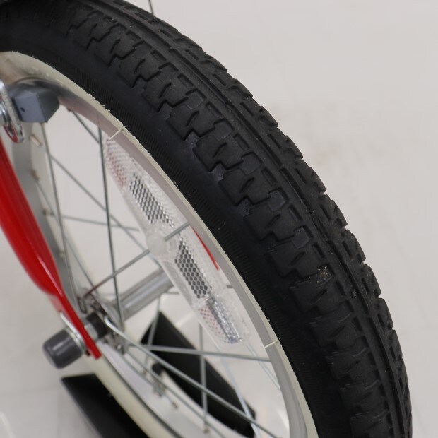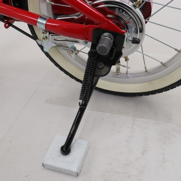 一部に傷がありますが、比較的状態の良い車体です。補助輪がスタンドに交換されています。泥除けが後付けされています。ステムカバー欠損。