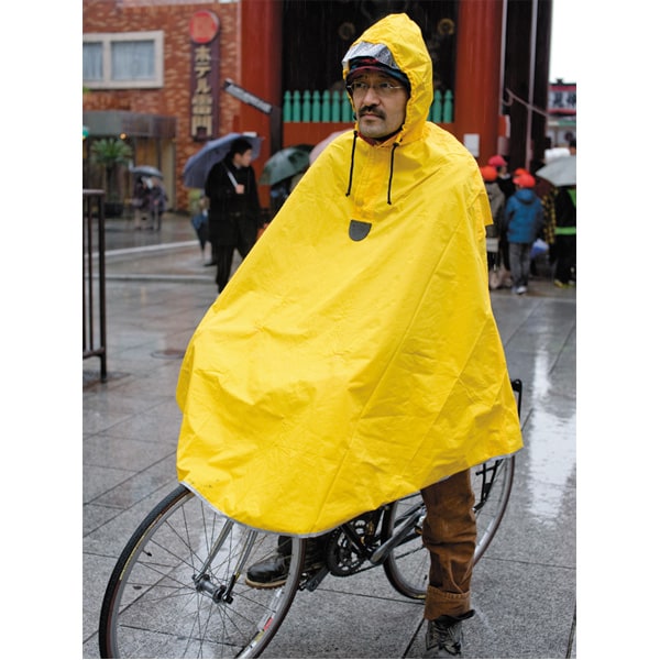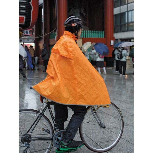 気温が高くても蒸れにくい自転車用レインポンチョ。 ベンチレーション、リフレクター、めくり上がり防止テープ、着脱フードと、自転車でもアウトドアでも利用できる機能を備えています。