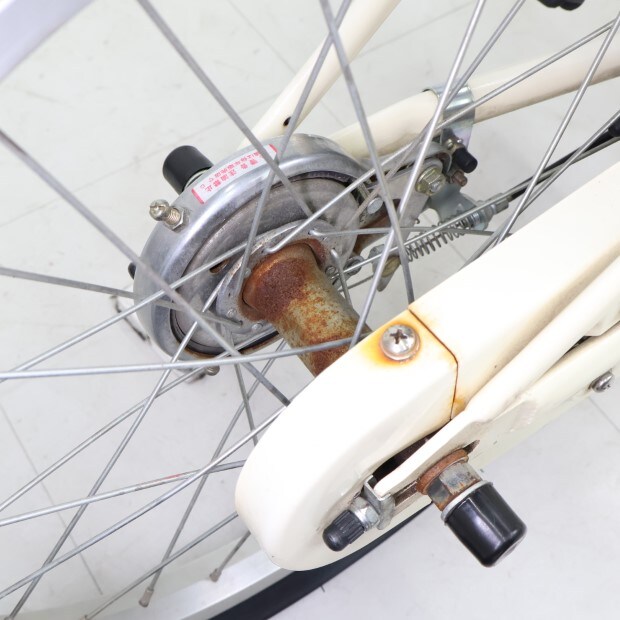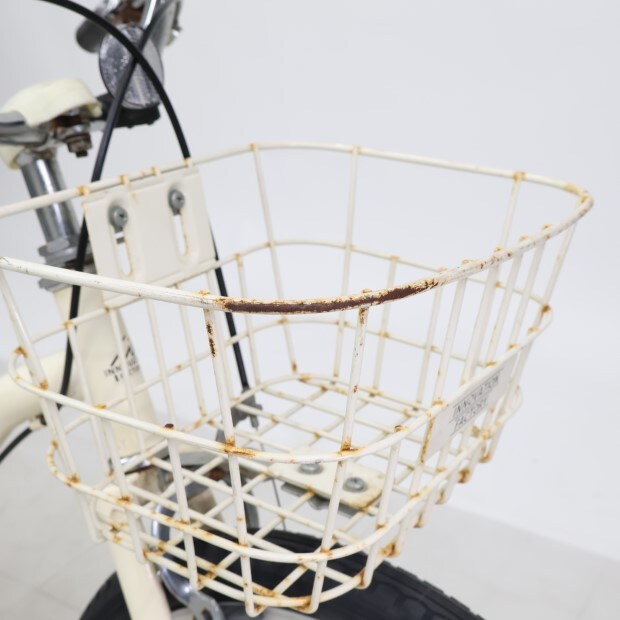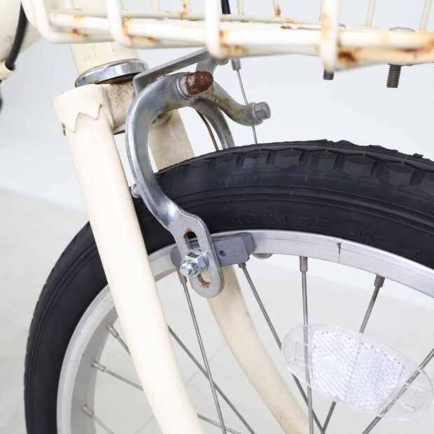 傷、錆あり。前カゴが後付けされています。補助輪がスタンドに交換されています。