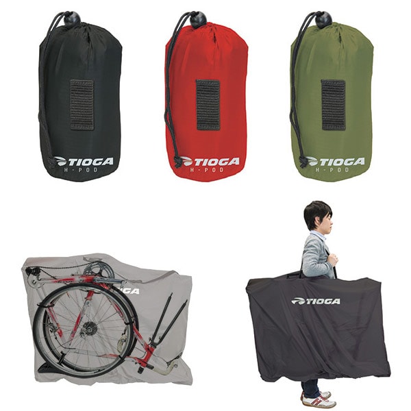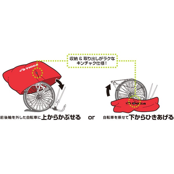 前後輪を外した自転車にかぶせるか、下から引き上げるかの2つの収納方法が選べる、ロード用輪行袋。