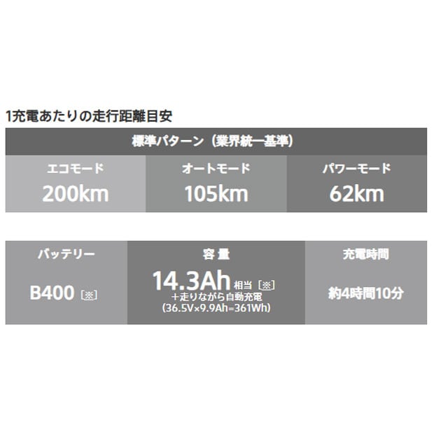 | 1充電あたりの走行距離の目安(標準パターン・バッテリー新品時) | エコモード:200km オートモード:105km パワーモード 62km |
