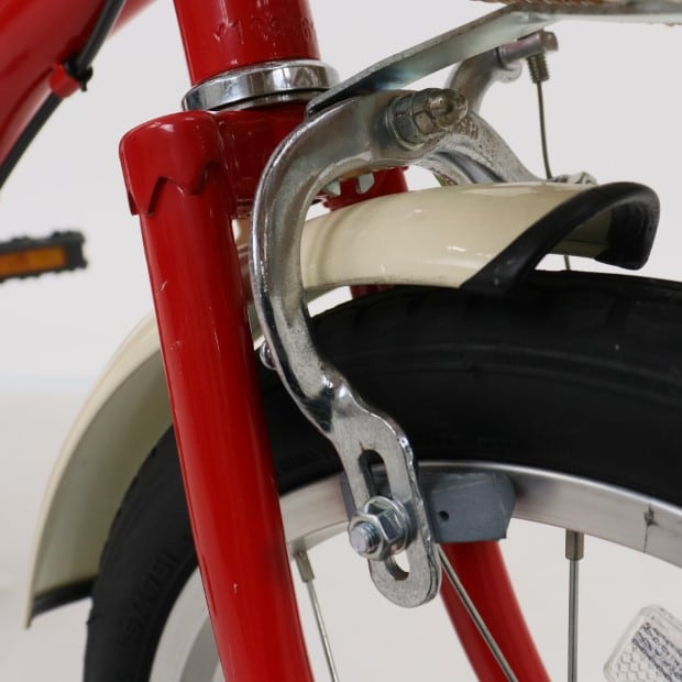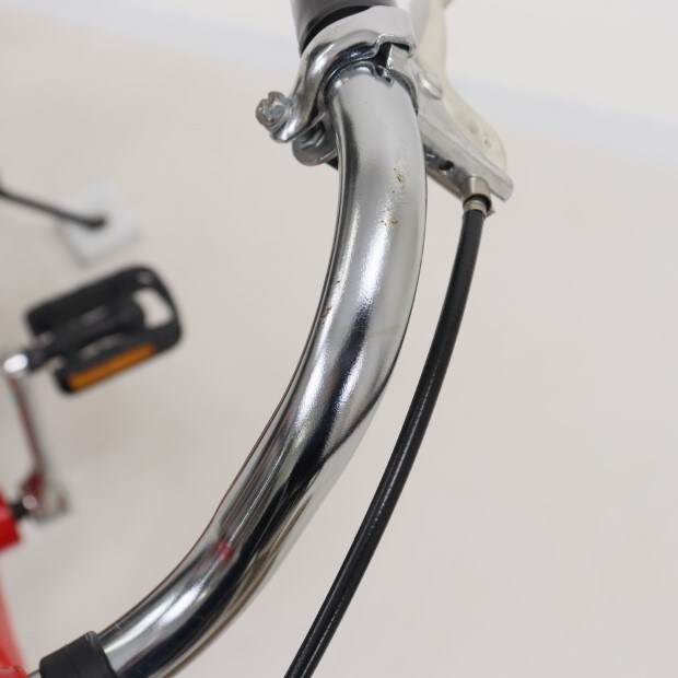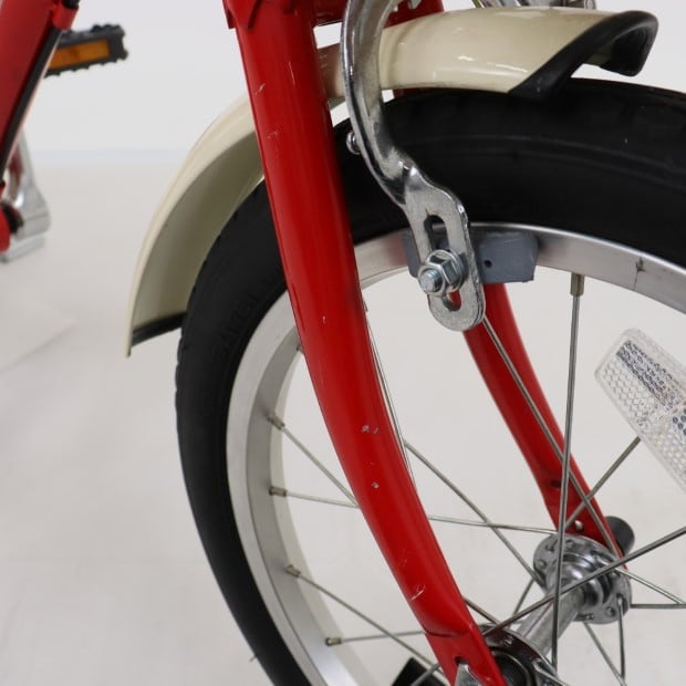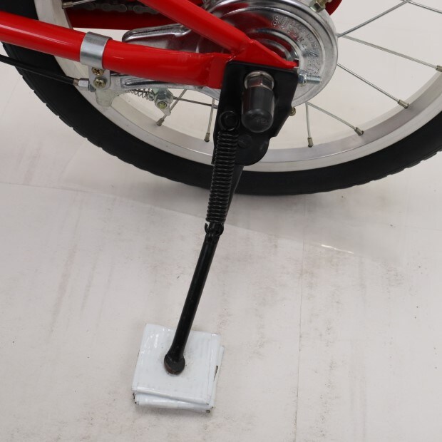 一部に傷がありますが、比較的状態の良い車体です。前カゴ、泥除けが後付けされています。補助輪がスタンドに交換されています。