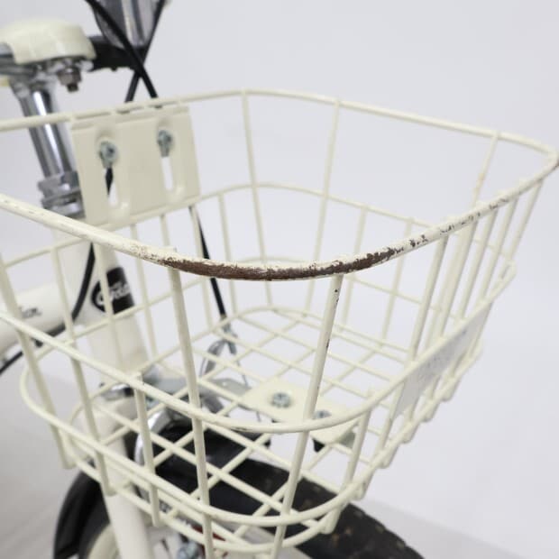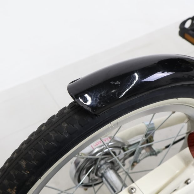 傷、錆、スレあり。補助輪がスタンドに交換されています。前カゴ、前後泥除けが後付けされています。