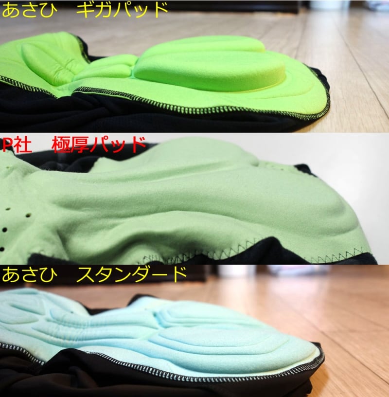 P社のパッドの違いとしては、骨盤部分の厚みに特化したのがギガパッド、お尻全体をなだらかに厚めにしたのがP社の極厚パッドと言う印象ですね。
