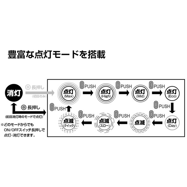 | 点灯時間(約) | 1.5時間(Maxモード)/ 2.5時間(Highモード)/ 4.5時間(Midモード)/ 13時間(Ecoモード)/ 60時間(Day Lightモード)/ 20時間(点滅)/ 20時間(スロー点滅)/ 70時間(クイック点滅) |
