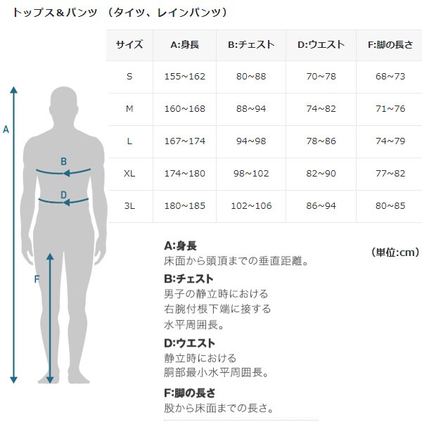 | A:身長 | B:チェスト | D:ウエスト | F:脚の長さ |