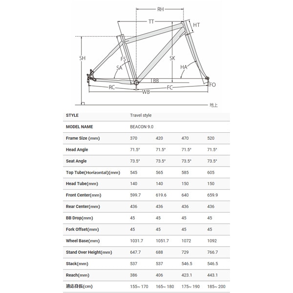 | SIZE(C-T)/適正身長(cm) | 370mm(150~165), 420mm(160~175), 470mm(170~185), 520mm(180~195) |