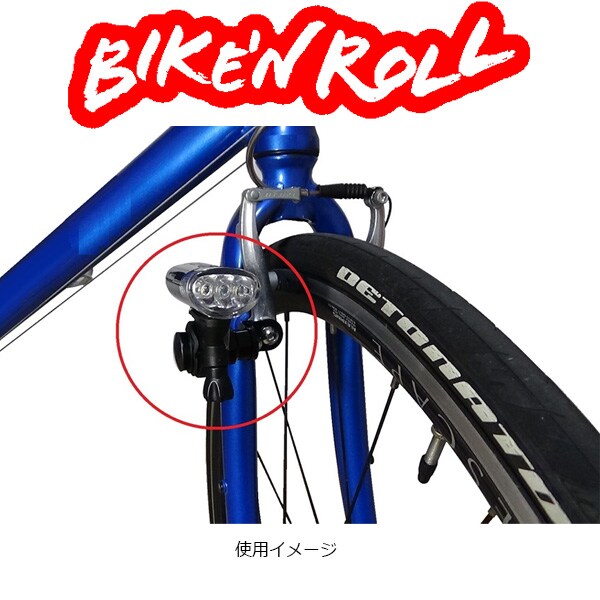 Vブレーキ近くにライトを装着。ハンドル回りがスッキリし、地面に近い位置にライトを付けられるので、より明るく道を照らします。