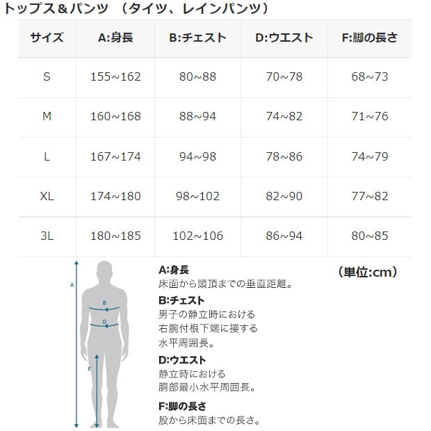 | A:身長 | B:チェスト | D:ウエスト | F:脚の長さ |