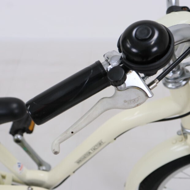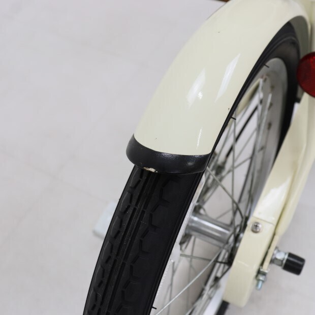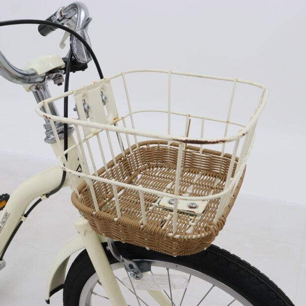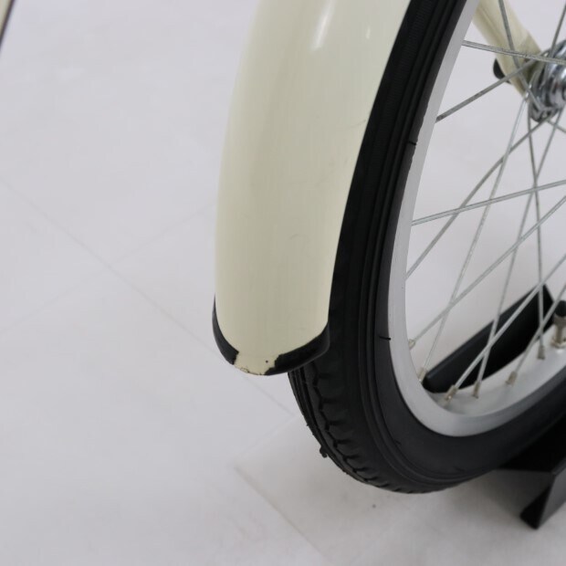 一部に傷や錆がありますが、比較的状態の良い車体です。補助輪がスタンドに交換されています。前カゴ、泥除けが後付けされています。