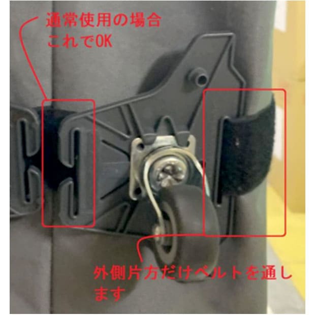 • ・そのほかの箱(従来型ACORバイクポーターなど)にはセットに付属のマジックテープを使用した2本のベルト(250cm)で取り付けます。