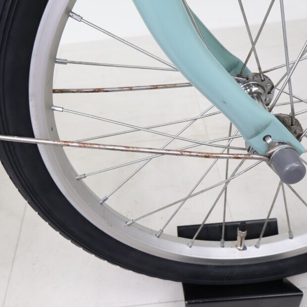 傷、錆あり。補助輪が両立スタンドに交換されています。前カゴが後付けされています。