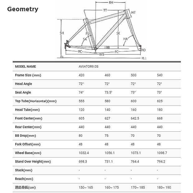 | SIZE(C-T)/適正身長(cm) | 420mm(150~165), 460mm(160~175), 500mm(170~185), 540mm(180~190) |