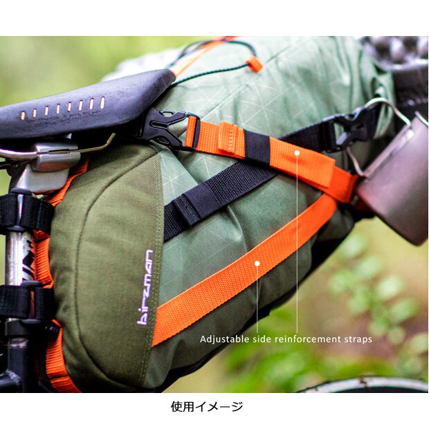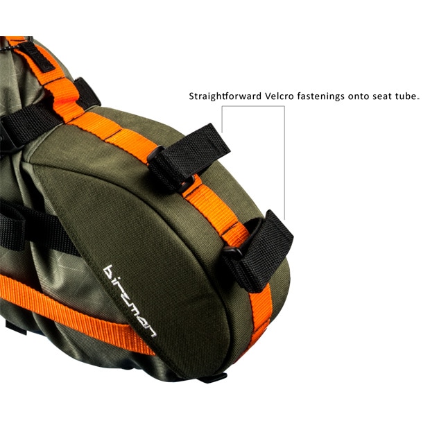 Packman Travel Saddle Packは、シートチューブへの簡単なベルクロ留めと、安定性を高めるための調整可能なサイド補強ストラップを備えています。