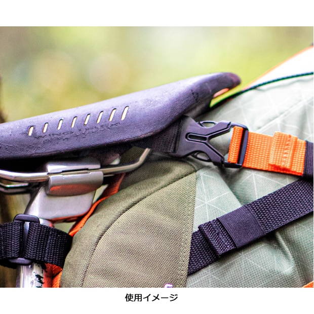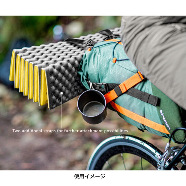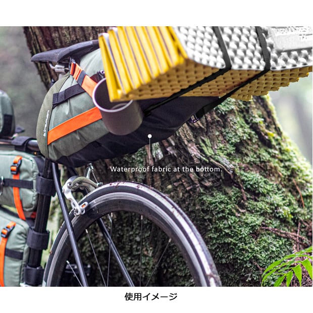 撥水・耐摩耗素材を使用した6Lの大型サドルバッグ。汎用性の高いストラップ固定タイプ。