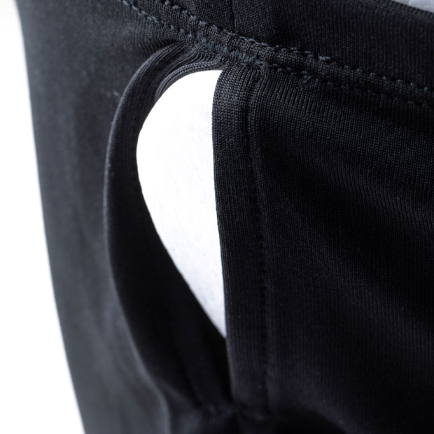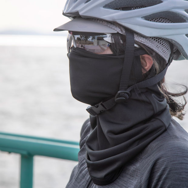 サイドに穴が開いており、耳にひっかけて着用できるため、走行中もフェイスカバーがずれたり落ちてこない設計。